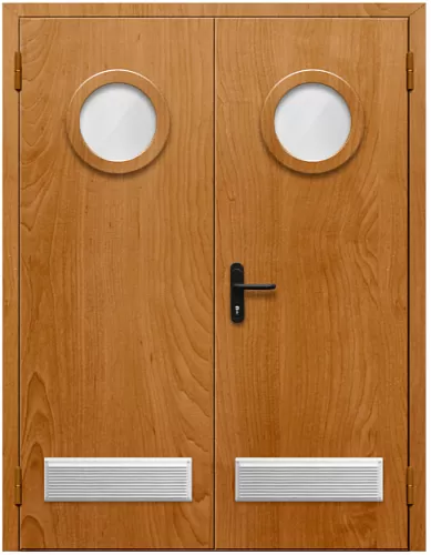Противопожарная дверь с одной решёткой двупольная со стеклянным иллюминатором
