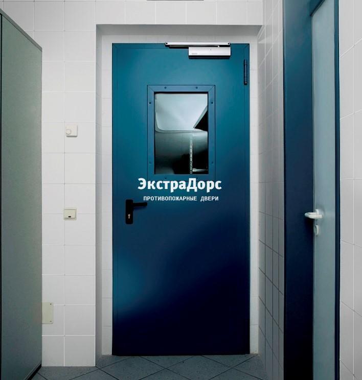 Противопожарная дверь 1 типа синяя c выпадающим порогом с остеклением в Подольске