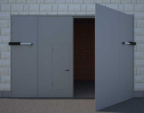 Серые распашные противопожарные ворота с калиткой