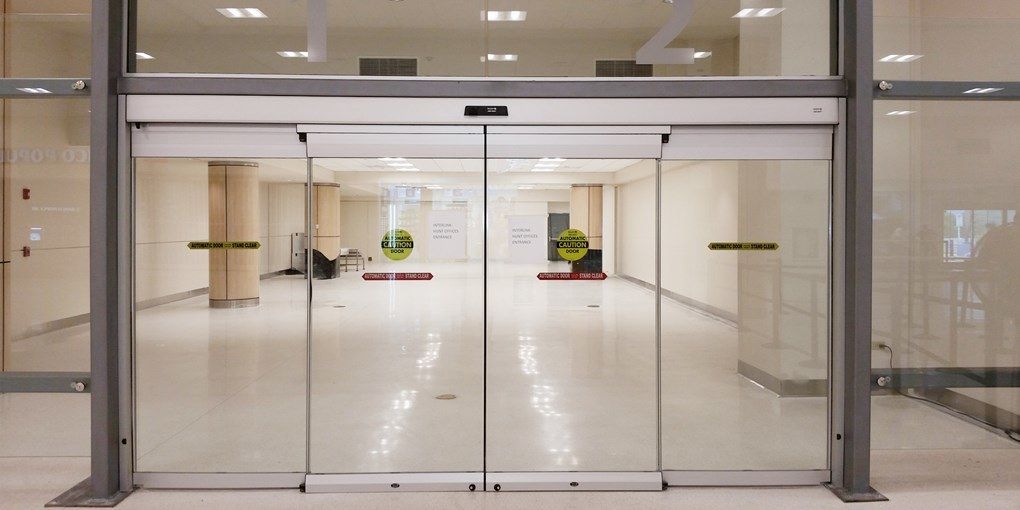 Противопожарная безрамная дверь со стеклом в бизнес центр в Подольске